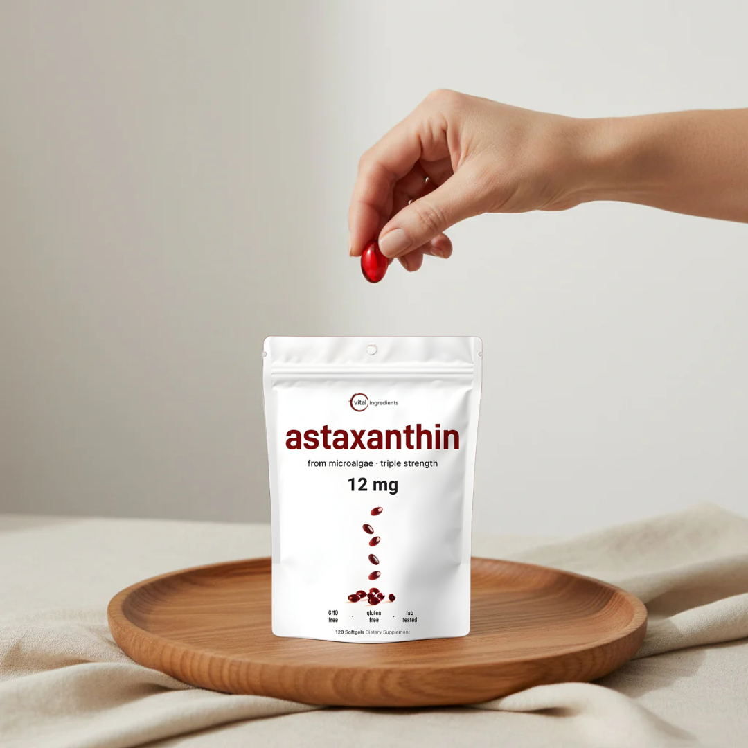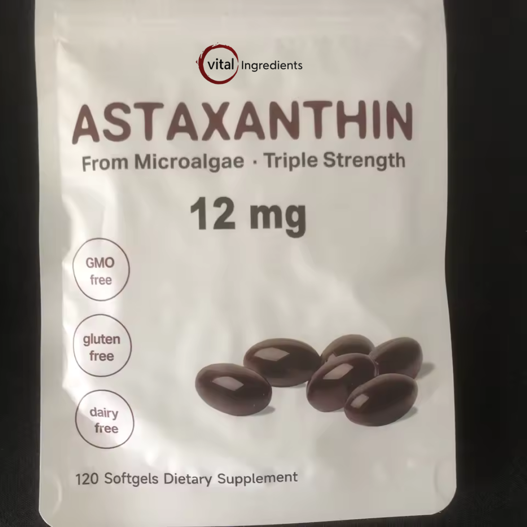 12 mg natural-source astaxanthin is the clinical sweet spot tested for skin elasticity, hydration, and UV protection.